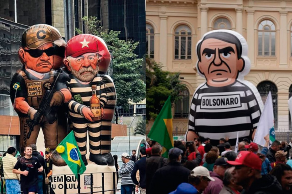 Na Praça da República, no centro da capital, grupos de esquerda e apoiadores de Lula exibiram um boneco gigante de Bolsonaro vestido com uniforme de presidiário, apelidado de “Bolsoleco”, já utilizado em atos anteriores.
